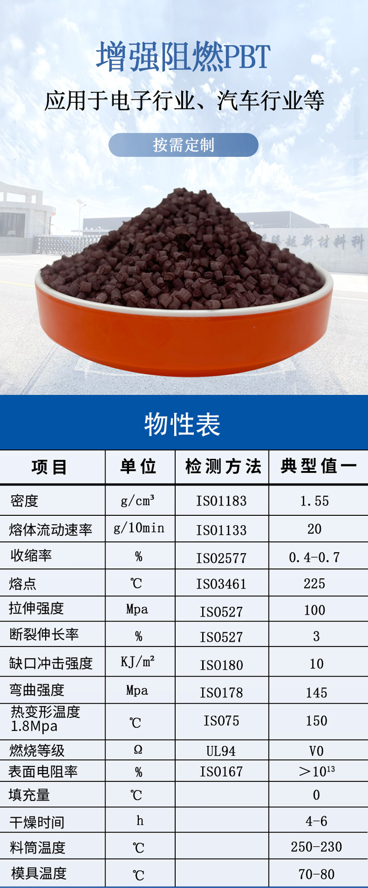 主成分由PBT樹脂、阻燃劑、玻纖組成。應(yīng)用于電氣和電子行業(yè)、汽車行業(yè)、工業(yè)設(shè)備、電器和家電、建筑和建材等,如電氣元件、連接器、絕緣子、汽車引擎零部件、汽車電氣組件、傳感器、管道、閥門、電器外殼、插座、開關(guān)和家電零部件電纜護(hù)套、管道等。